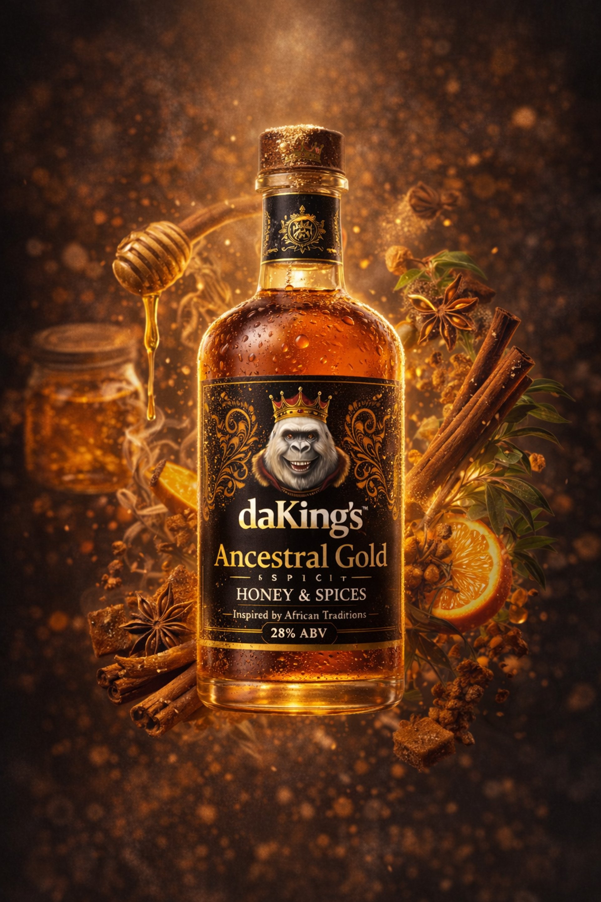 Smooth cultural liqueur blending forest honey, warm African spices, and subtle herbal tones.